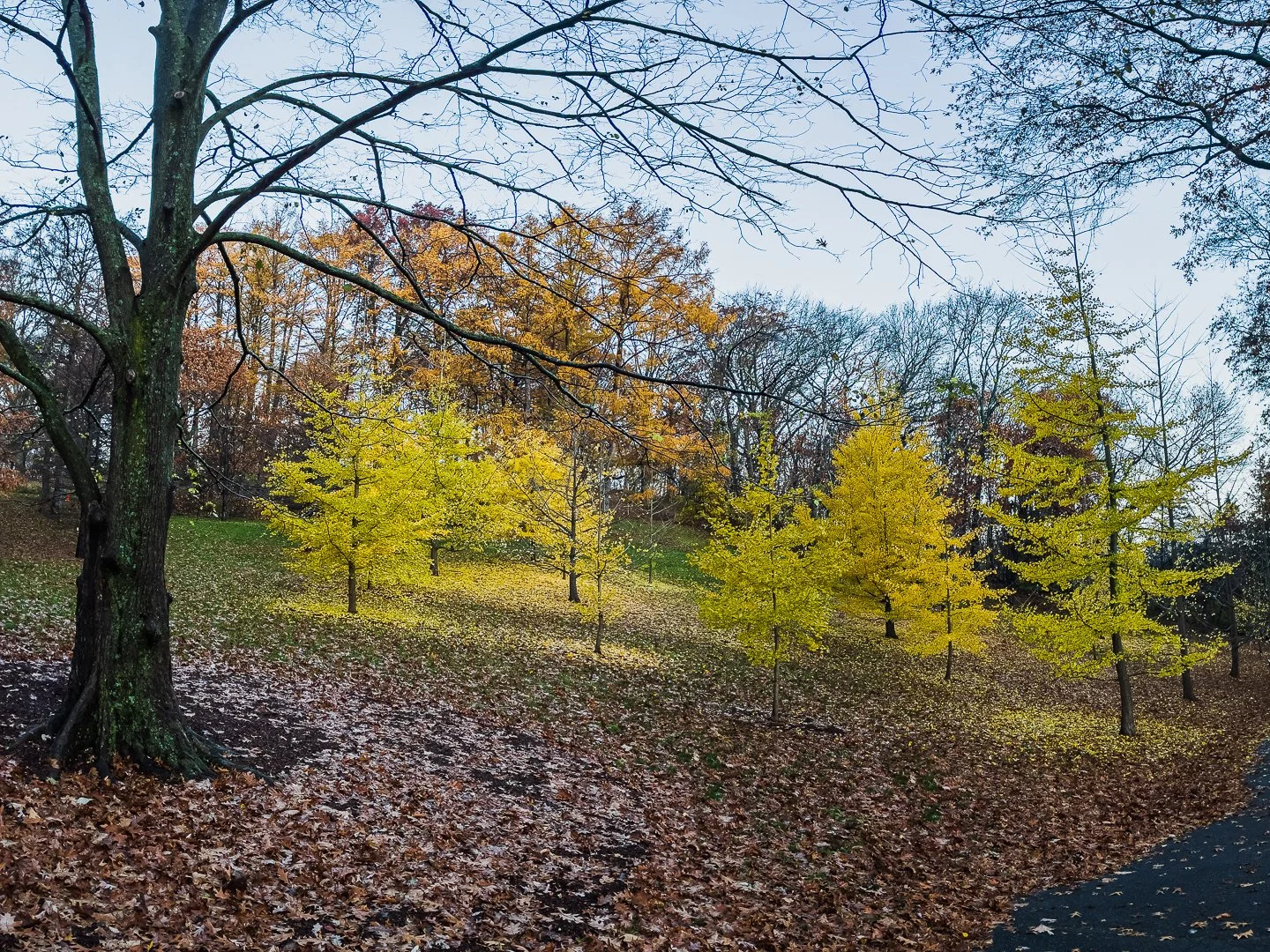 The Arboretum is a curious place. At once a peaceful haven for the natural world and a curated collection of trees and shrubs. So this grove of ginkgo trees might never manifest in a forest in this way, yet here they are.