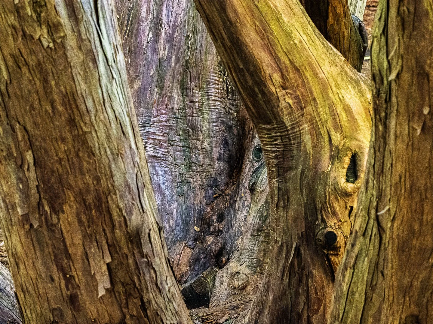 From close up, I could look inside the ring of trunks of this almost 100-year-old yew. It felt like a tiny sanctuary, a place of refuge, having grown over time, with purpose or not. Because there was another set of eyes taking in the scene, I found myself looking more intently, me with my camera, she with her colors.