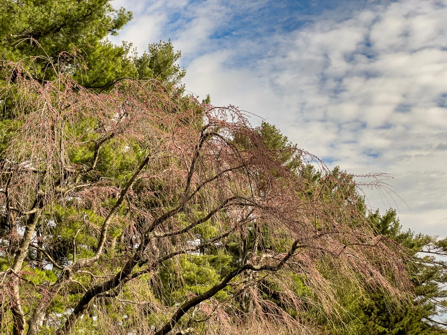 Now, as some trees begin to flower, the view of the limbs is more likely to be obscured. What I can’t see of the tree’s skelton is replaced with a view of the emerging buds. The baby flowers lend a hint (or in some cases, a riot) of color, especially to the newest, thinnest, top-most growth, which is more visible.