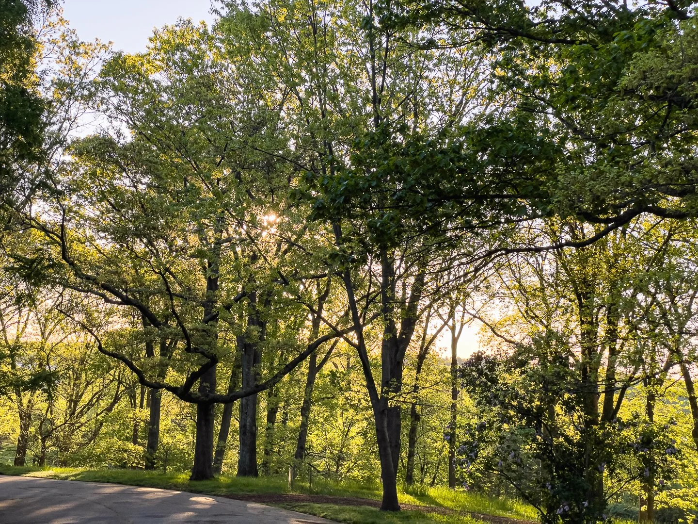 I walk at roughly the same time each morning. In the deep of winter I would be up and out - and sometimes home - before the sun rose. Those days are over for the moment. Now when I reach the Arb somewhere between 6:00 and 6:15, the sun is well and truly risen. Yet it is still low in the sky so the light filters through the trees on this side of Peters Hill.