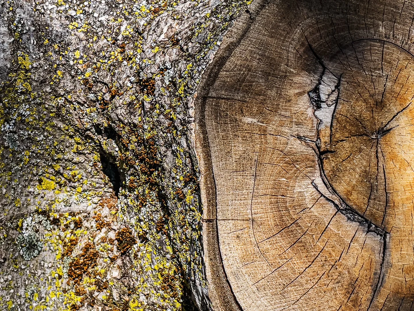 The presence of these two different elements - different textures, different colors, different shapes - adds to the story of the shot. The arduous detail of the bark, with wrinkles and discolorations, gives way to the smooth area of the lost limb. They are almost in balance but there remains some incongruity.