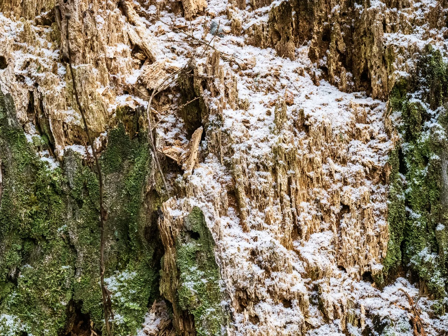 Scale is a funny thing. When you narrow the field-of-view down sufficiently, it’s hard to sort out what you’re looking at. So this snow-dusted rotting stump takes on some of the characteristics of a mountain scene, especially if you look at it carelessly.