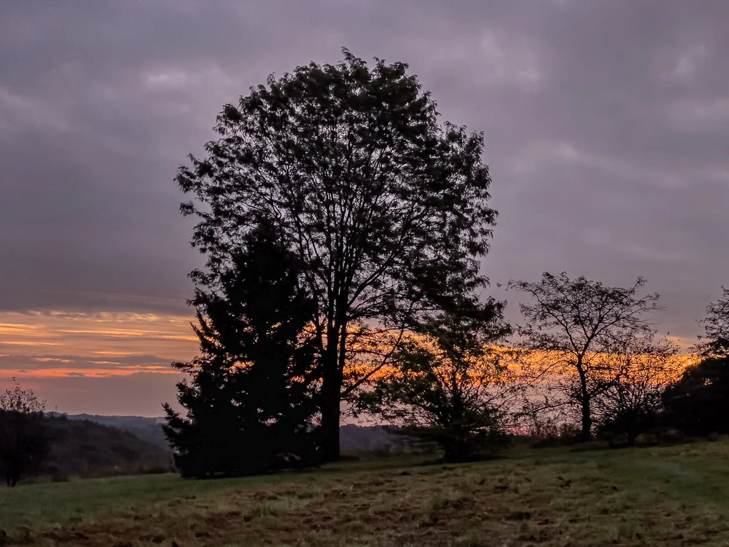 The birds are waking and singing. Dawn dark, quiet, calm, complete in itself, the landscape looks pristine. I’ve not seen another human and only the birds and a rabbit or two. I hear the cars in the near distance. I know I’m not alone and, to my surprise, that’s a comfort. I have this space to be with myself without losing my connection to other people, something harder to do when I lived in the woods. I notice that I’m here in this moment, and all is well.