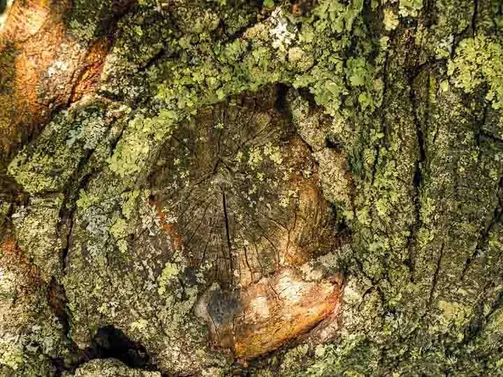 Somewhere on the orchard hillside of Peters Hill, there is a plum tree that looks like it’s had a rough life. Am I equipped to make that assessment? Honestly, no. That’s just the sense I got looking at it and looking at this image. I don’t have the scientific background to assess the balance between the healing where a limb was severed and the encroaching growths on the surrounding bark.